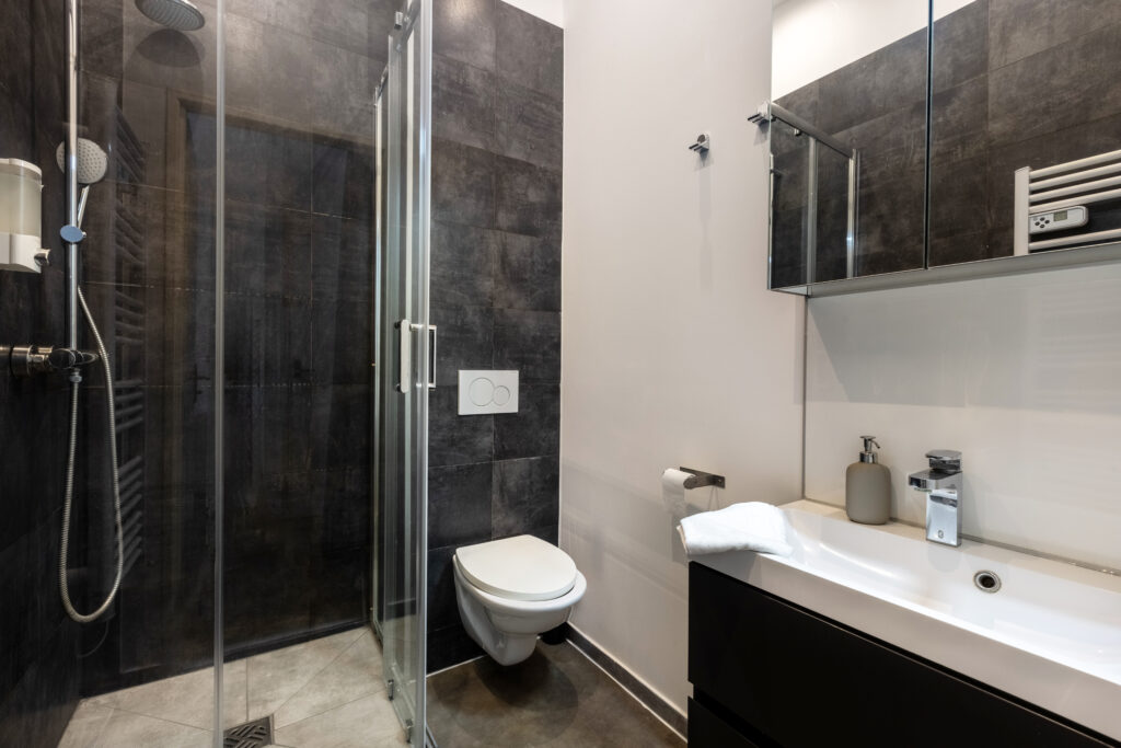 • Une douche moderne et un meuble vasque avec miroir.