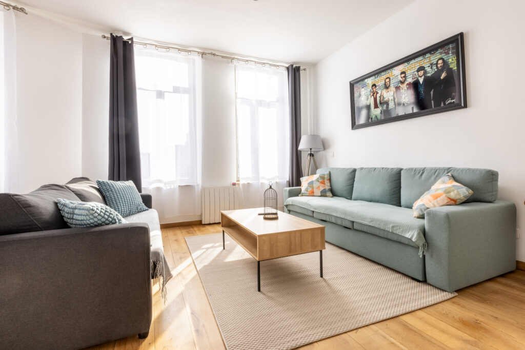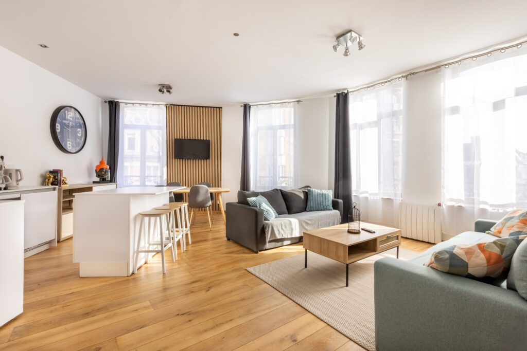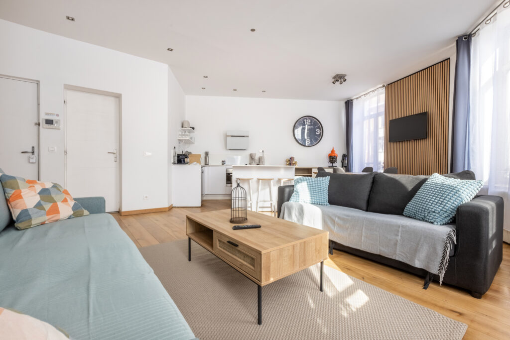Ambiance : Une décoration contemporaine soignée, un parquet chaleureux et de larges fenêtres qui illuminent tout l’espace de vie.