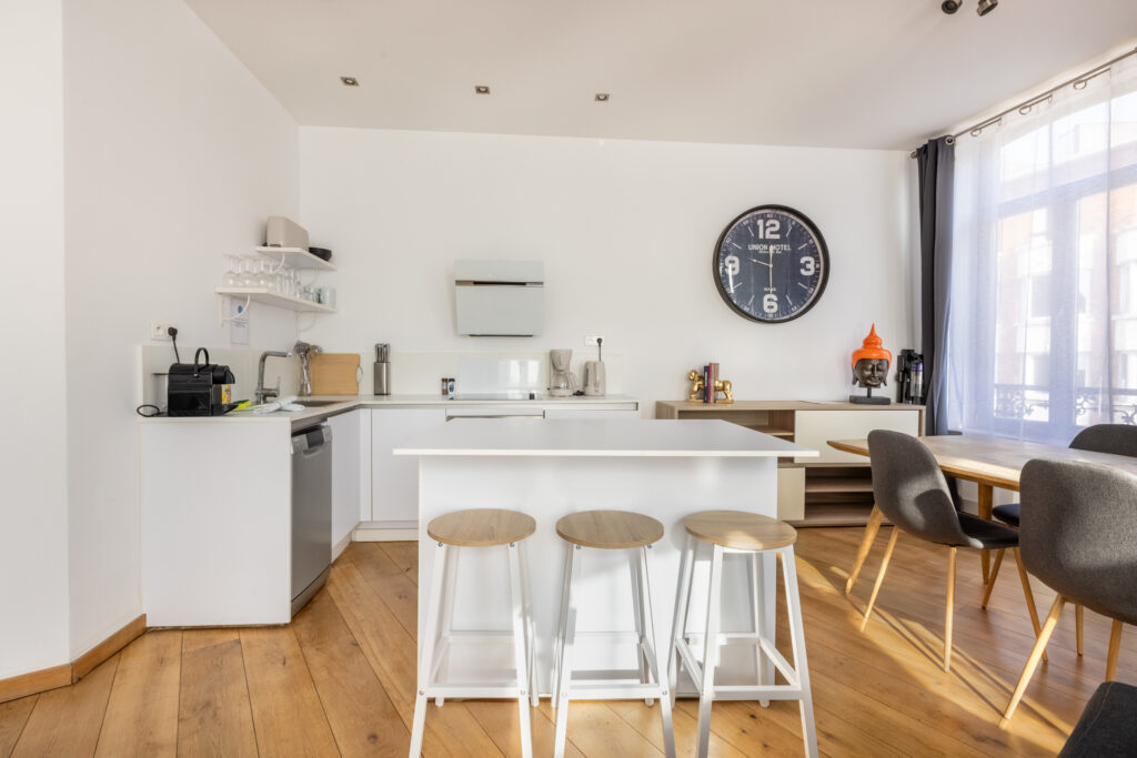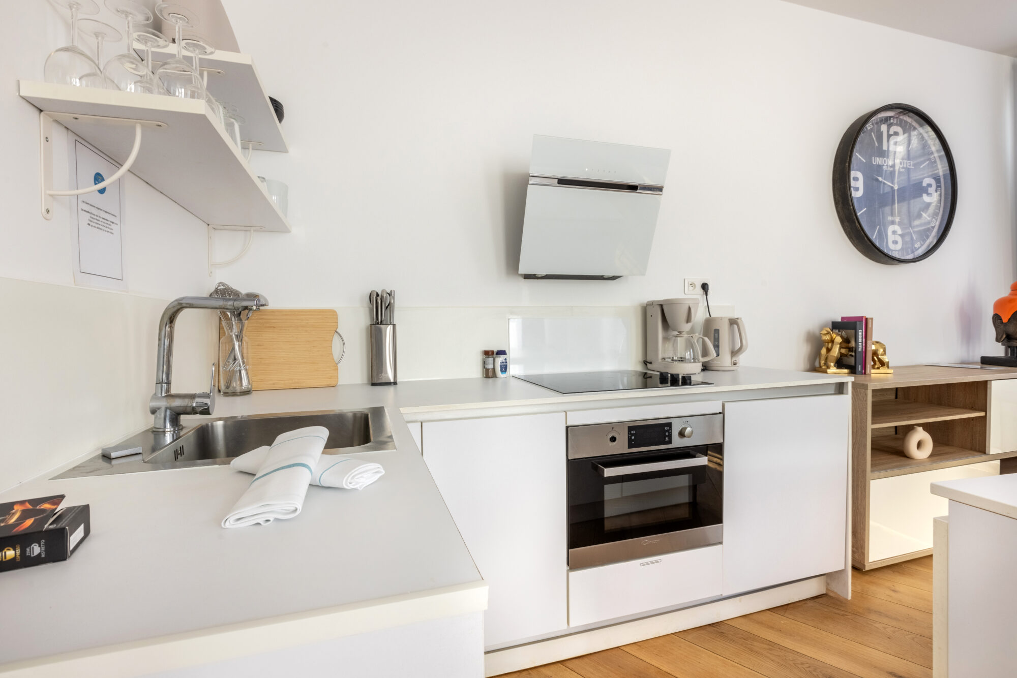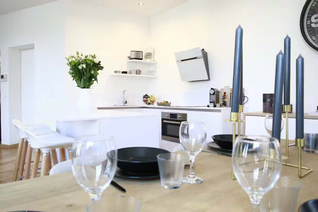 - Cuisine : Ouverte et moderne, équipée d’un lave-vaisselle, four et machine Nespresso.
