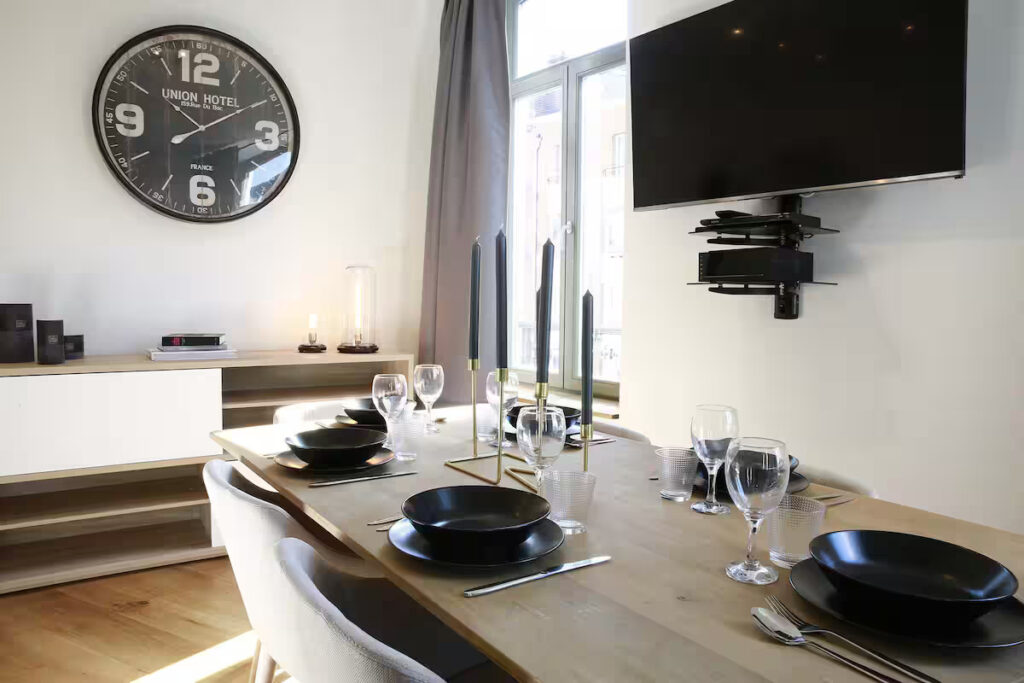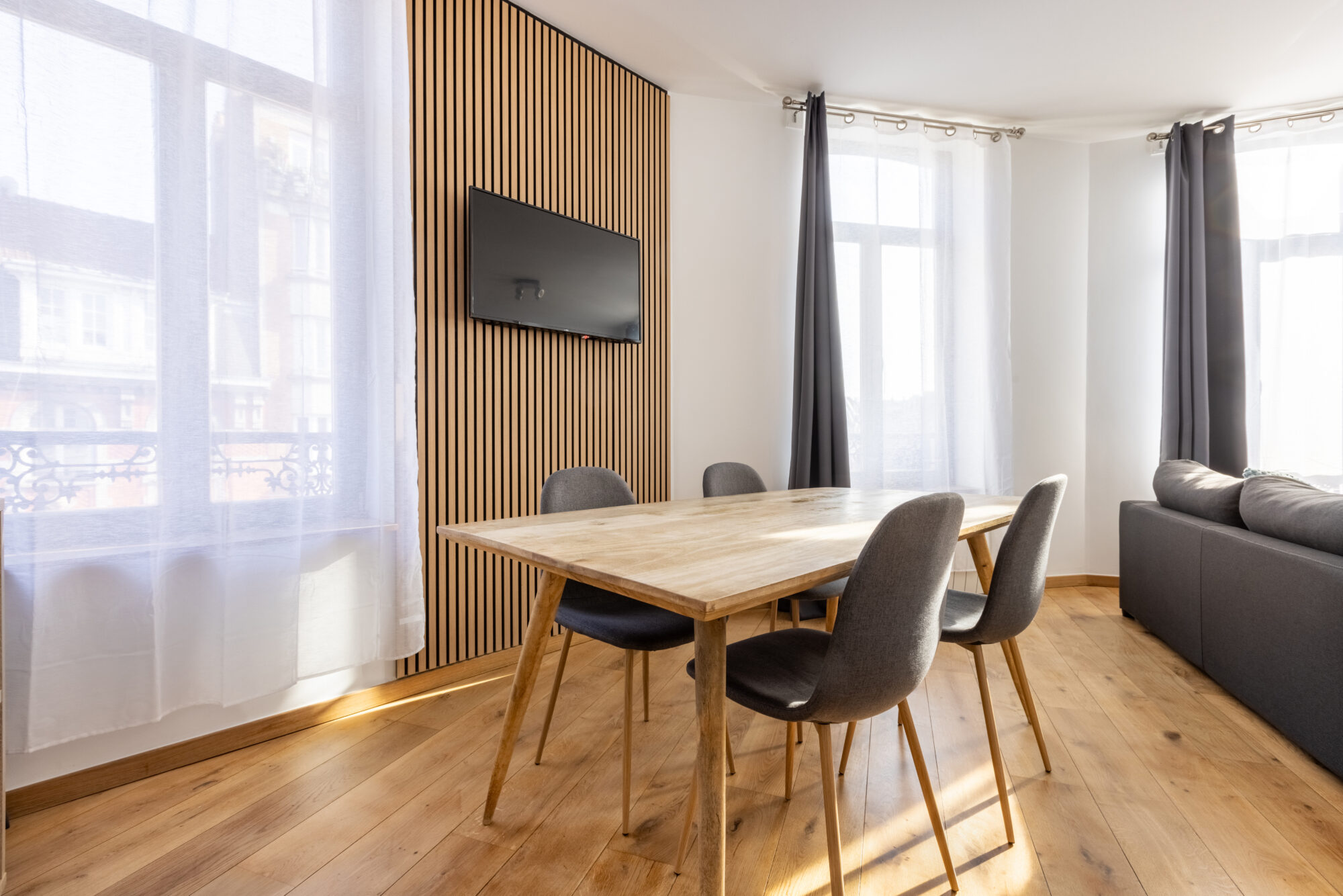 Coin repas : Une table conviviale pour 4 personnes, idéale pour les dîners ou pour travailler confortablement.