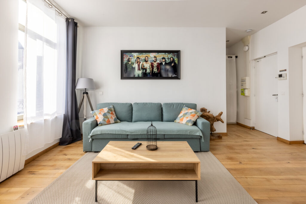 Espace détente : Un grand coin salon avec un canapé 3 places convertible (literie de qualité pour 2 personnes supplémentaire) et une télévision 40 » fixée au mur.