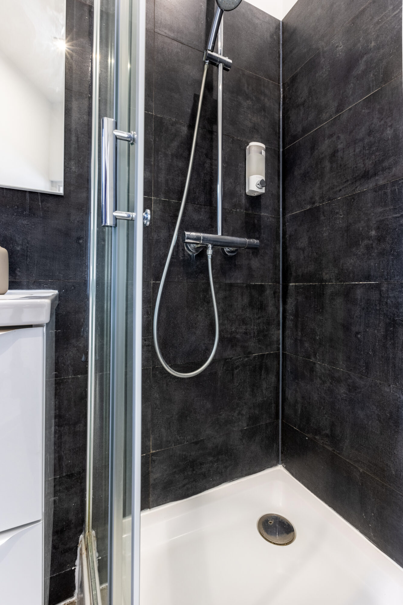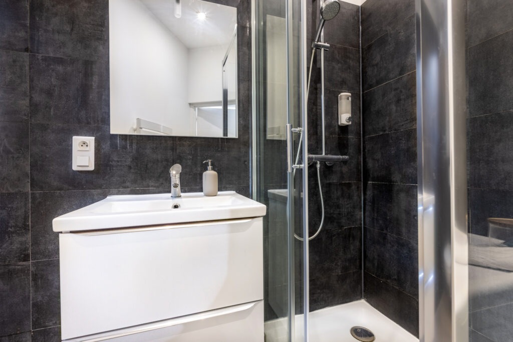 Une douche spacieuse avec paroi vitrée et carrelage anthracite design.