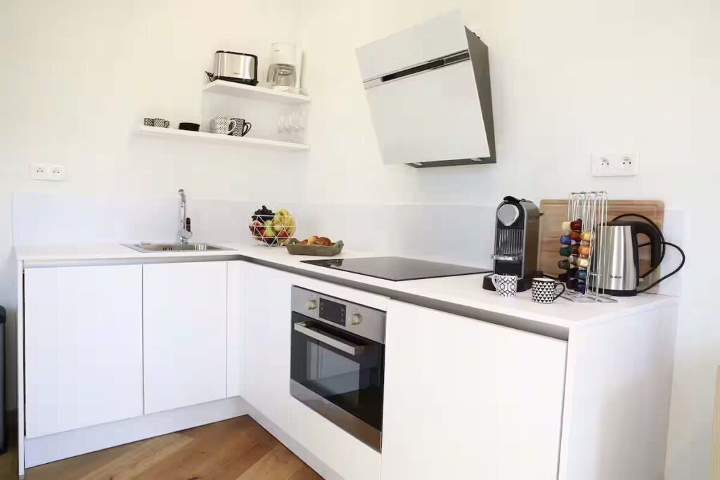 Équipement complet : Plaques de cuisson, four, hotte aspirante, machine Nespresso, bouilloire et grille-pain.