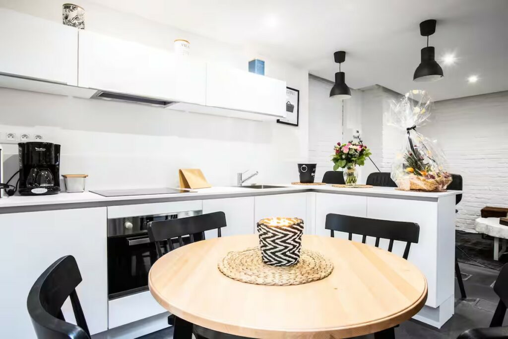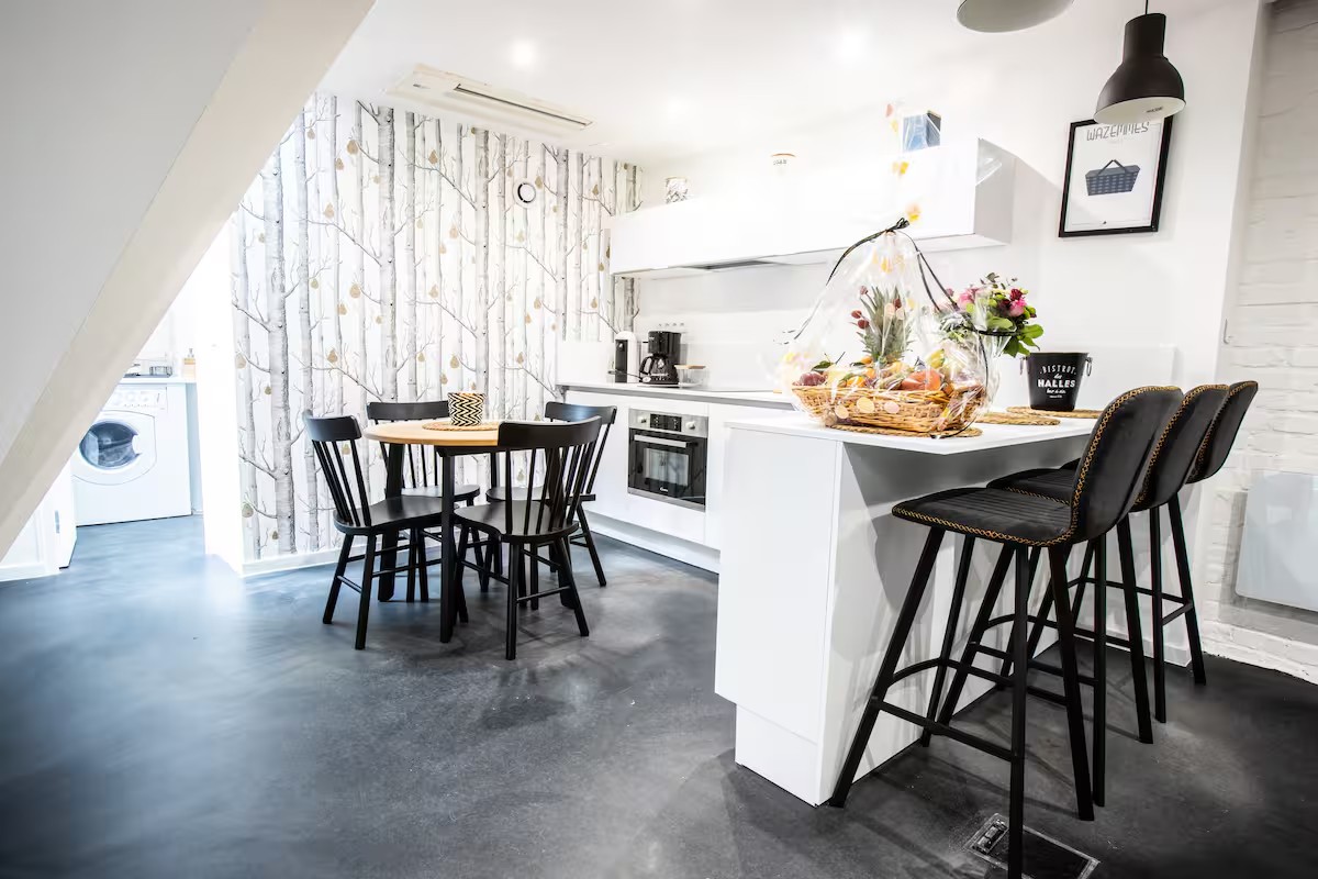 • Équipements complets : Elle dispose de plaques à induction, d’un four, d’un lave-vaisselle, d’un micro-ondes et d’une machine Nespresso.
