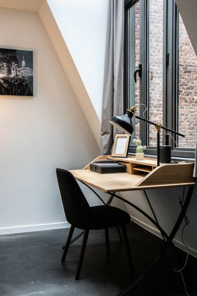 • Coin Bureau : Un magnifique bureau secrétaire en bois avec lampe vintage est installé sous la fenêtre, parfait pour le télétravail ou pour s’organiser durant le séjour.