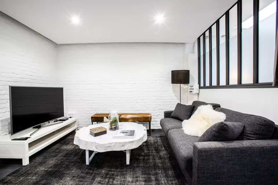 • Décoration : Un grand mur de briques blanches apporte une touche authentique et lumineuse à la pièce.