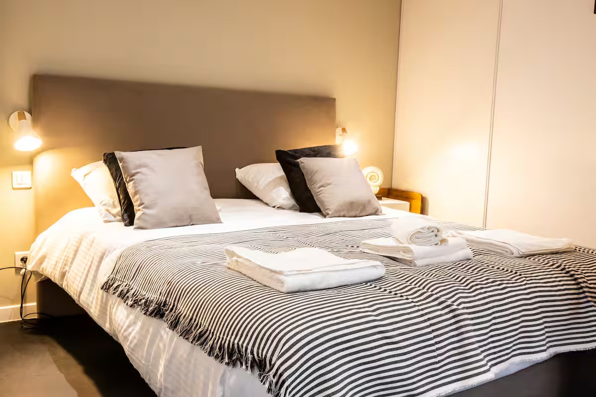 • Nuit : Un lit double « Queen Size » (160×200) avec tête de lit capitonnée beige vous assure un confort hôtelier.