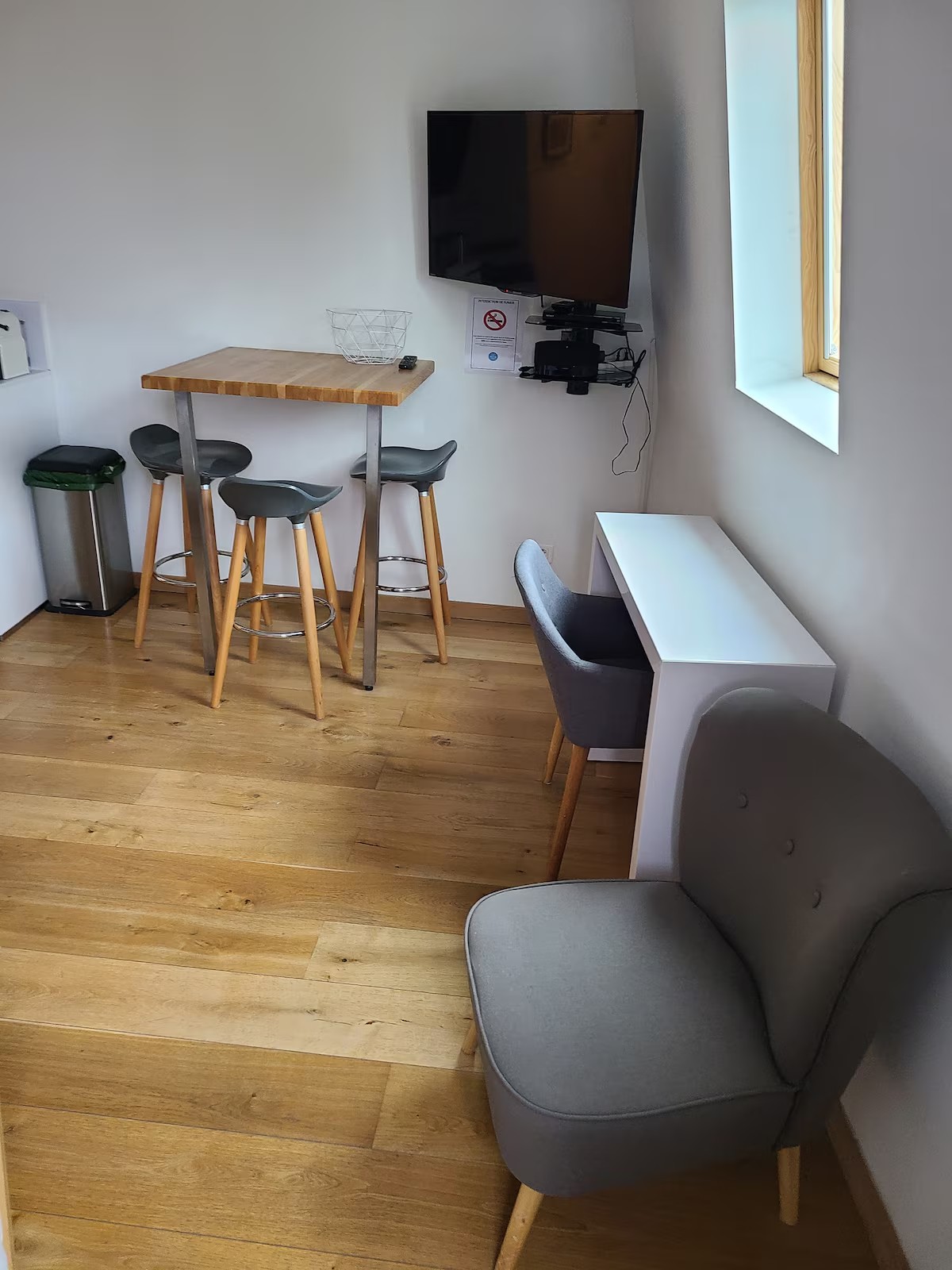 • Espace repas : Une table haute en bois massif accompagnée de 4 tabourets permet de dîner ou de prendre le petit-déjeuner de manière conviviale.