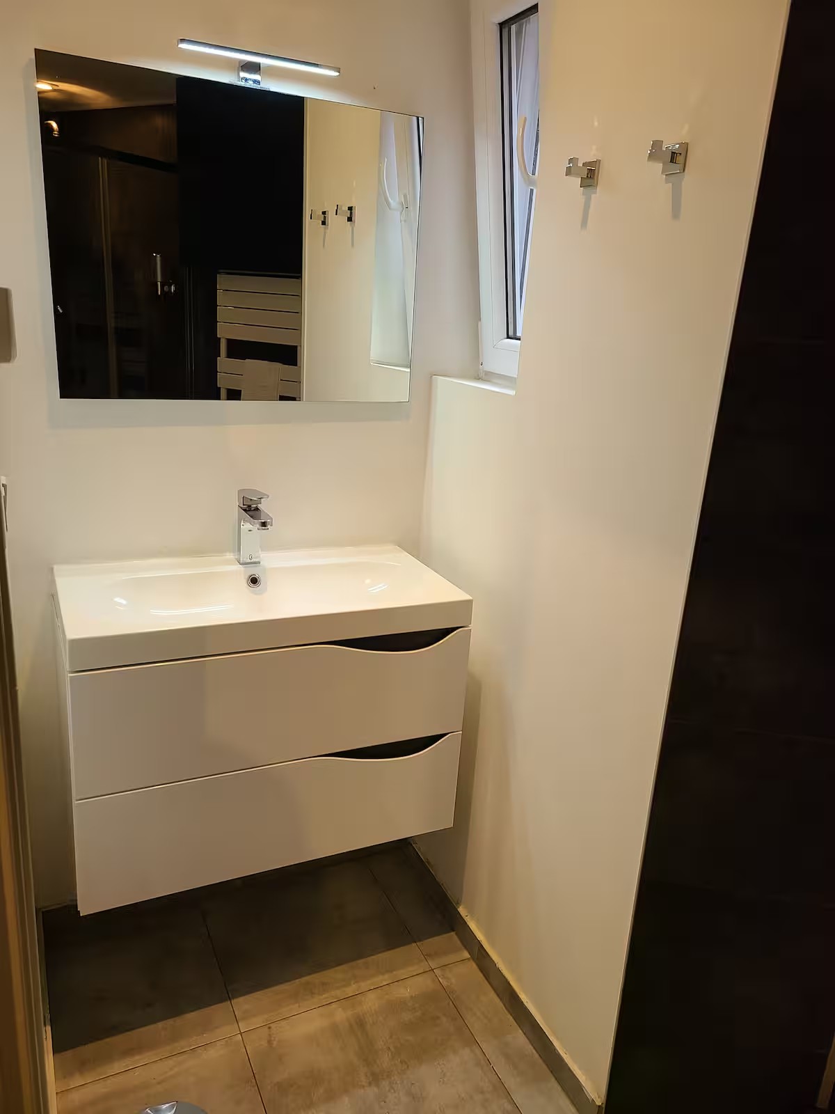 • Un meuble vasque avec miroir et rangements.