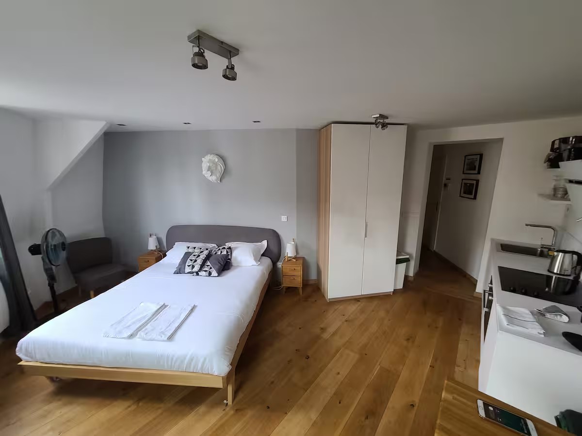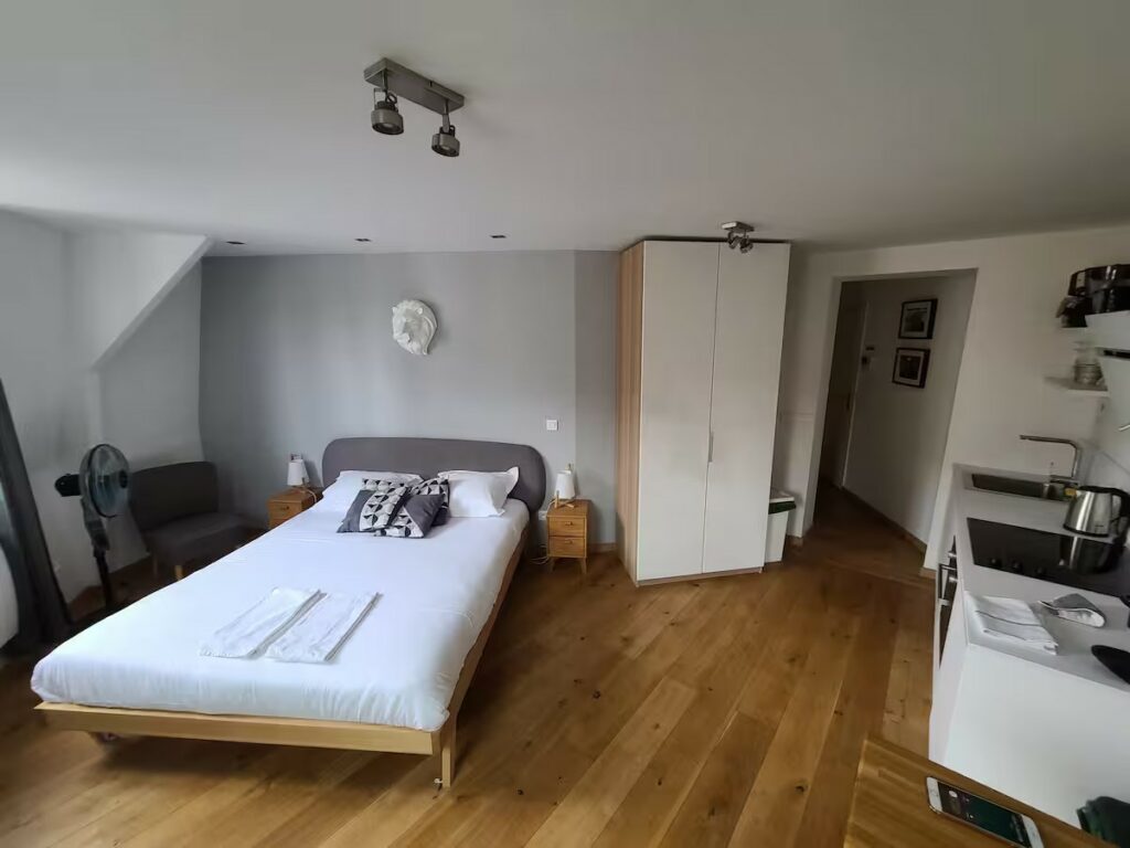 • Espace Nuit & Travail : Lit Queen Size (160×200), coin bureau fonctionnel et TV 40″.