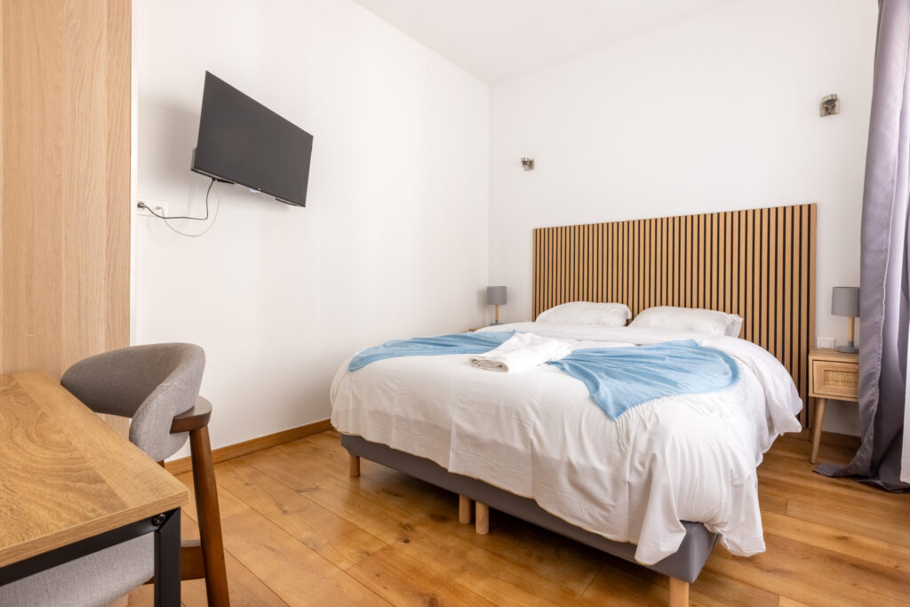 Équipements : On y trouve une seconde télévision murale pour vos soirées cinéma, ainsi qu’un espace bureau pratique pour les voyageurs d’affaires.