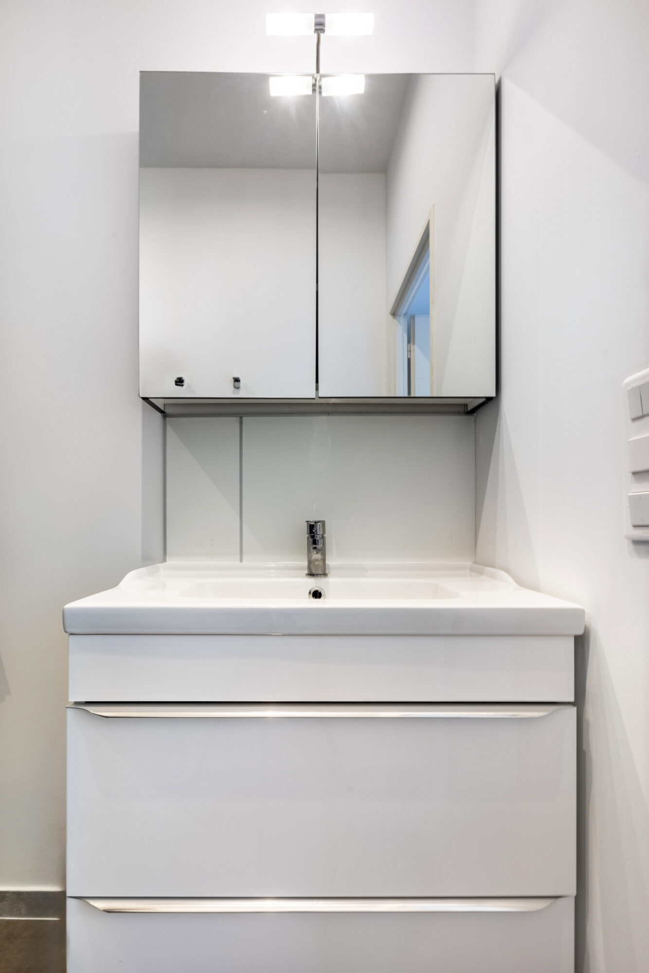 Commodités : Un meuble vasque noir avec rangements, un grand miroir rétro-éclairé, des WC suspendus et une machine à laver pour faciliter vos séjours de longue durée.