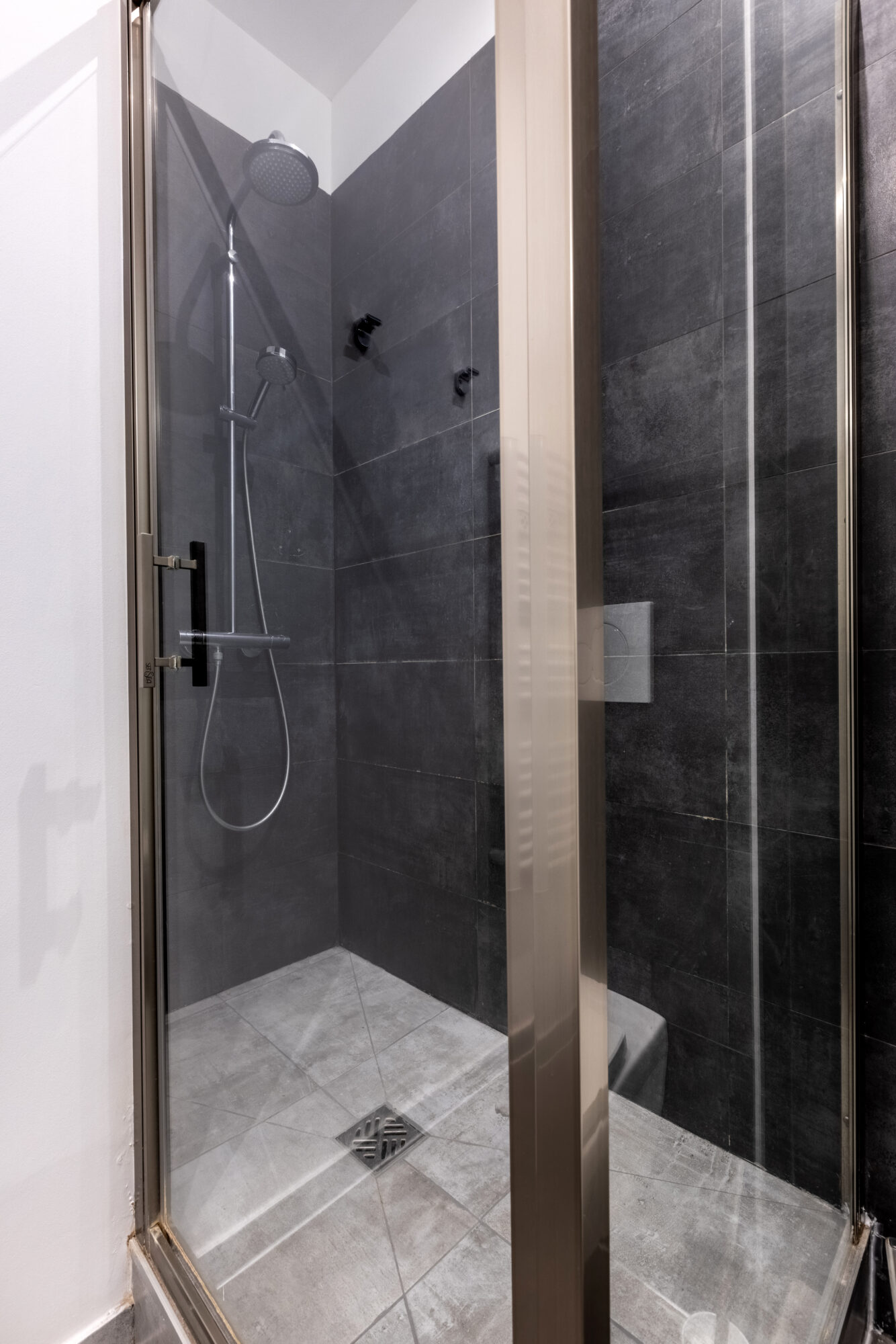 Douche : Une douche spacieuse avec un mur d’accent en carrelage gris anthracite.