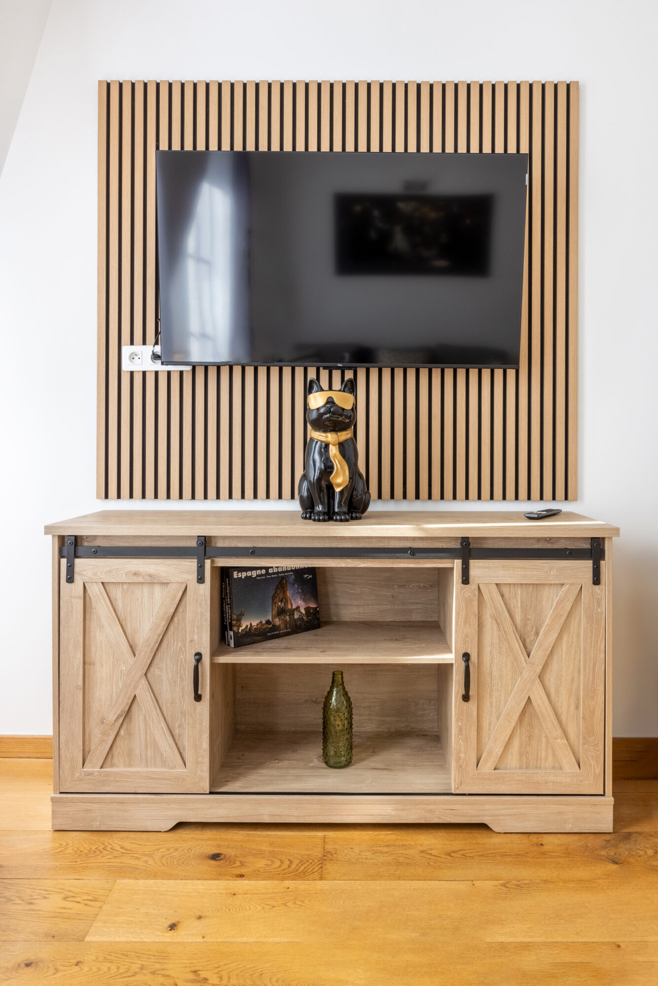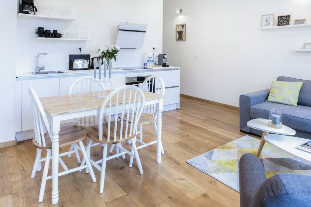 Décoration : Le parquet massif et les murs blancs créent un espace sain et apaisant, complété par un buffet blanc épuré pour le rangement.