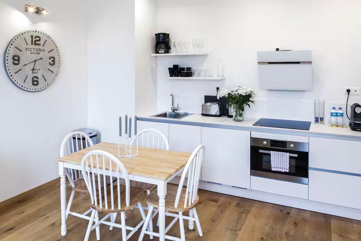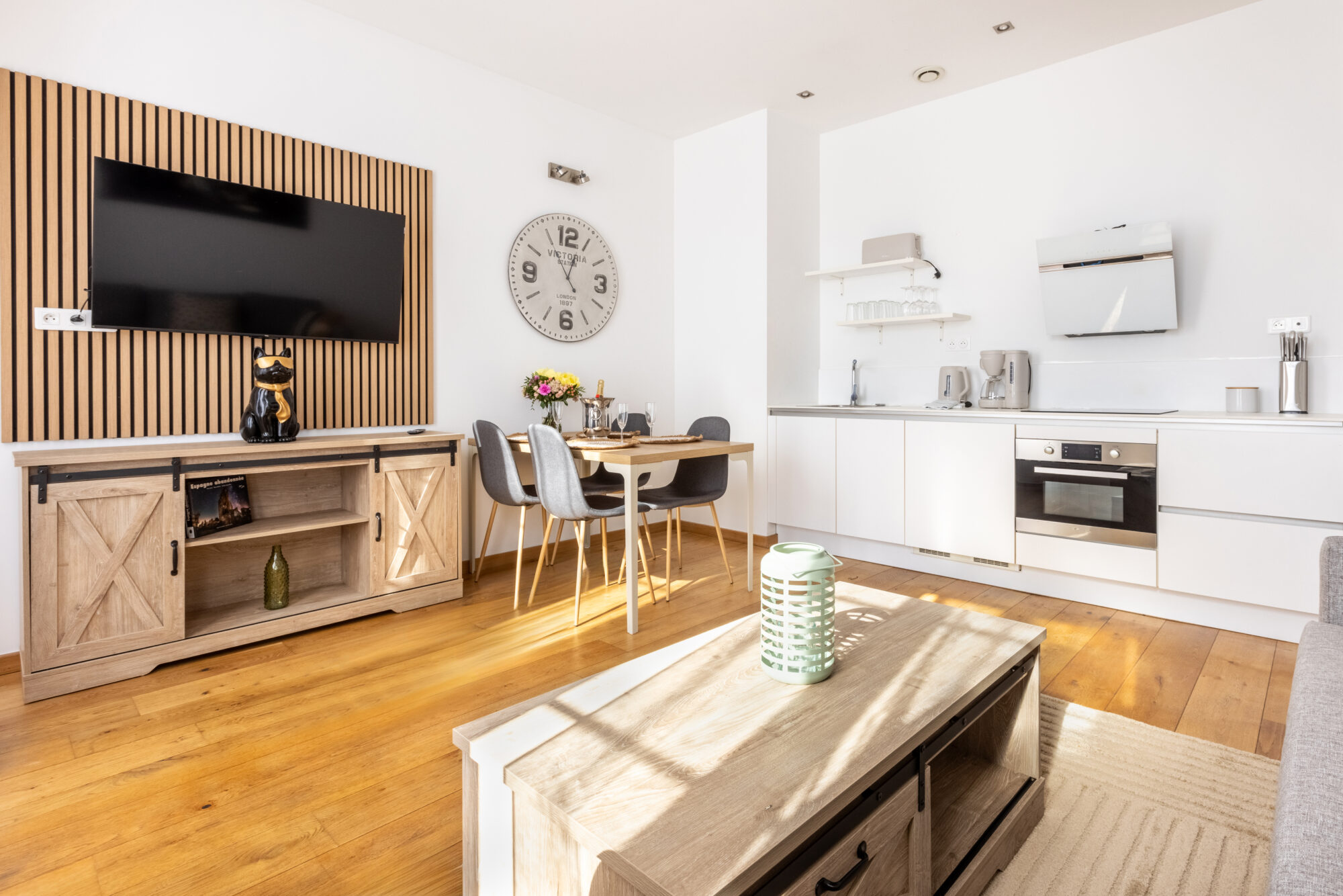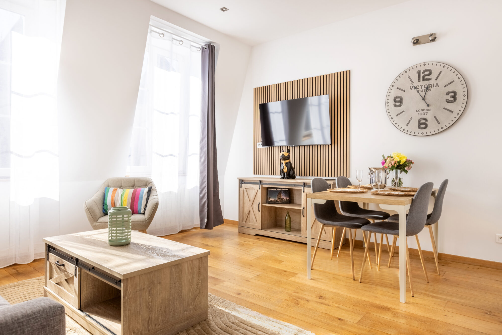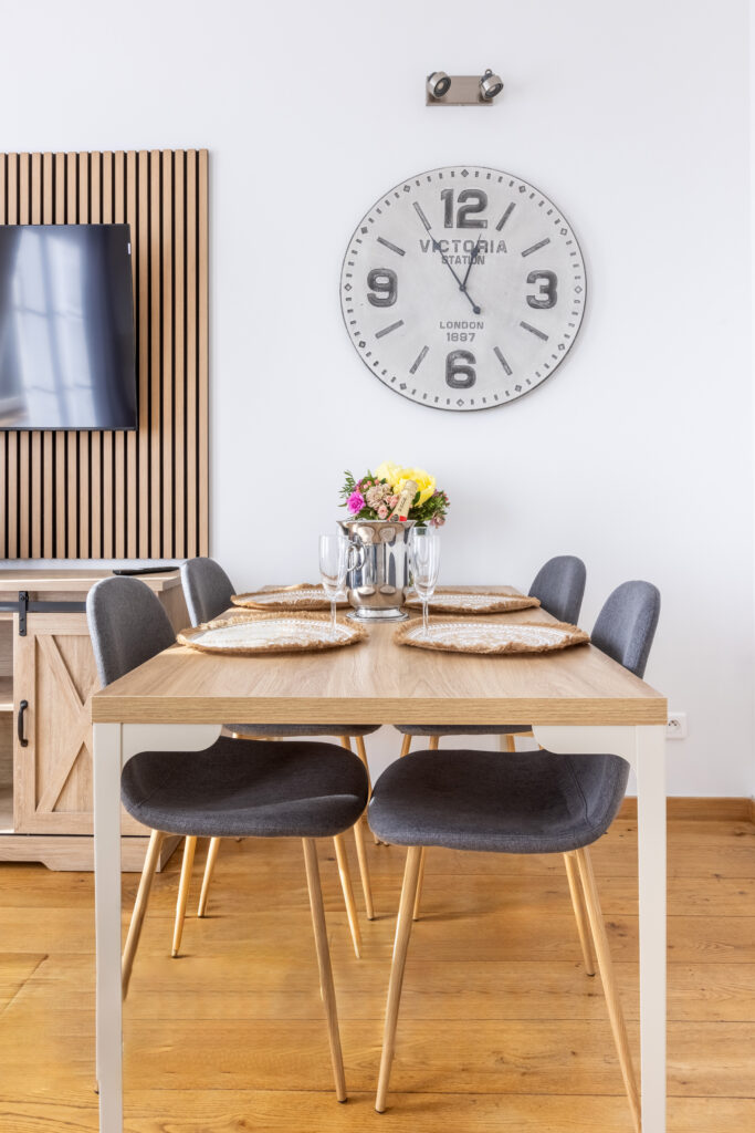 Le coin repas : Une table en bois clair entourée de quatre chaises blanches au style « Windsor » crée un espace dînatoire convivial, surplombé par une grande horloge « Victoria Station » qui donne un cachet unique à la pièce.
