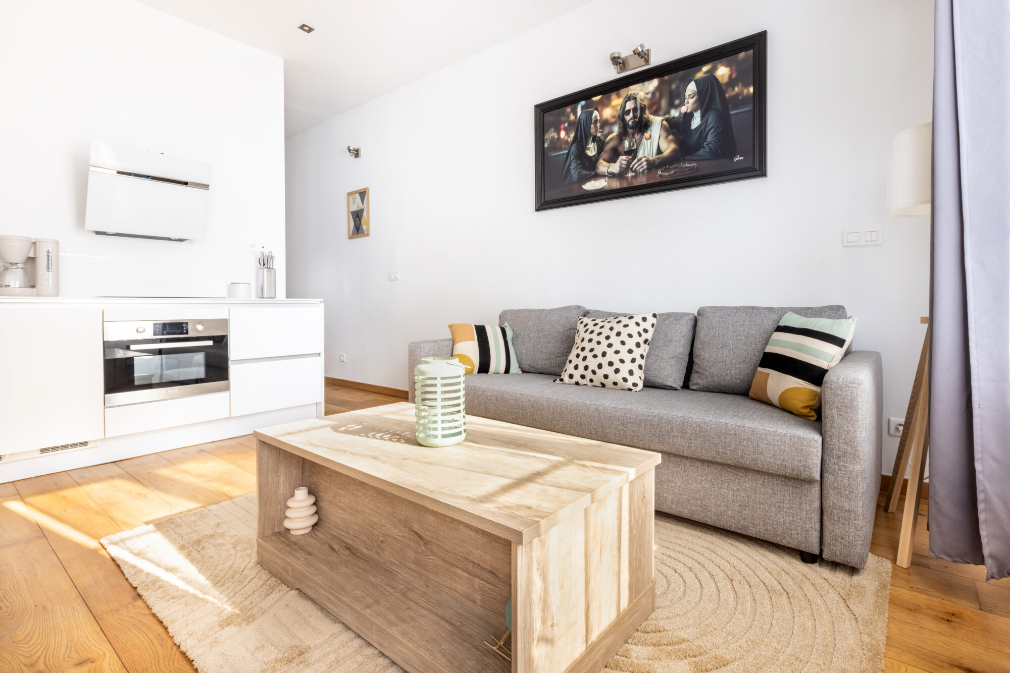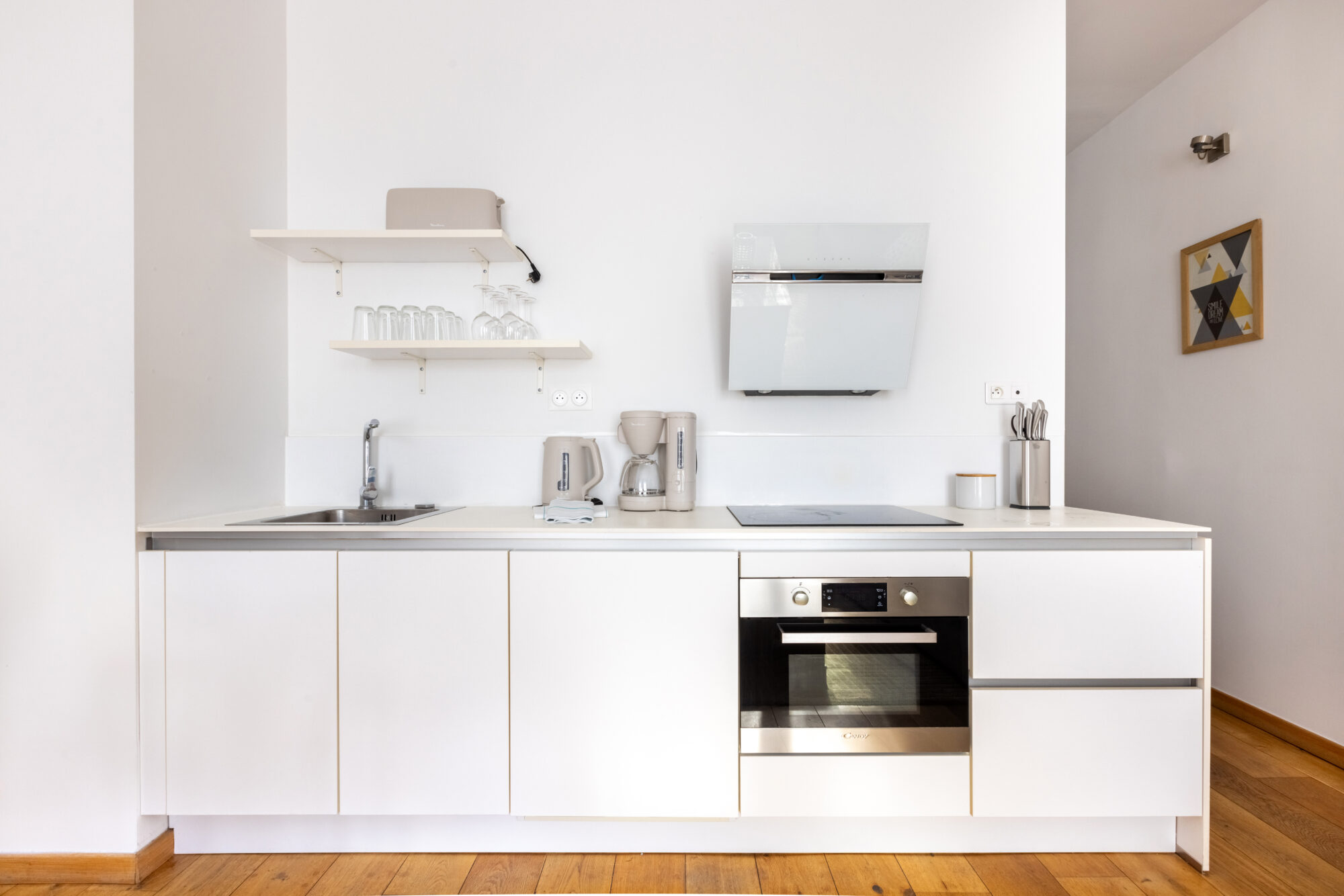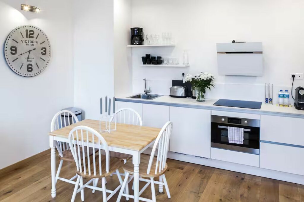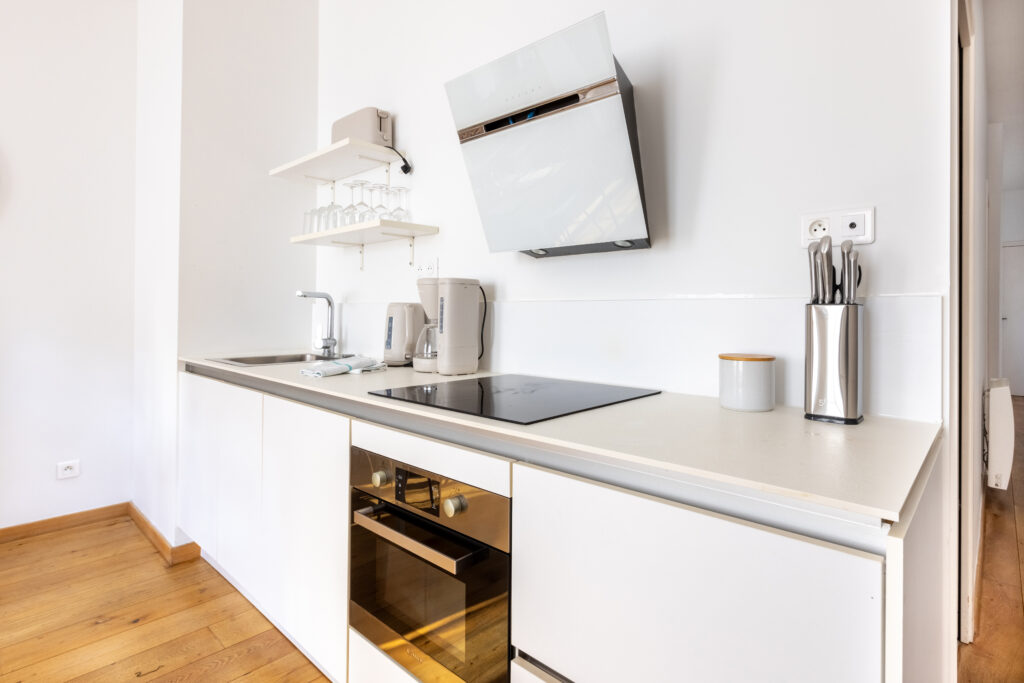 Équipement complet : Elle est dotée de plaques à induction, d’un four, d’une hotte, d’un micro-ondes et de tout le nécessaire (Nespresso, bouilloire, grille-pain).